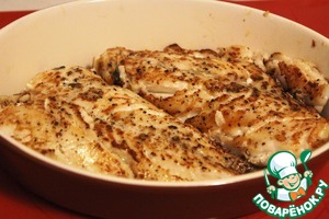 Обжарить рыбу с обеих сторон на сковороде в разогретом оливковом масле по 5 - 7 минут с каждой стороны, переложить в форму для запекания. Готовить в духовке, нагретой до 200 град. в течение 15 минут. |