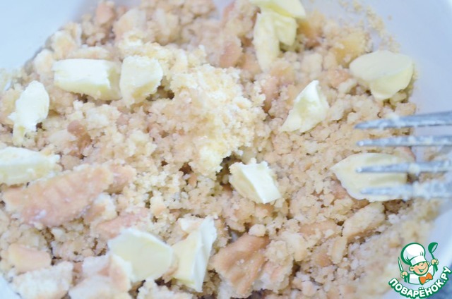 Добавим размягчённое сливочное масло, хорошо перемешаем. Выкладываем в разъёмную круглую форму, хорошо утрамбовываем и выпекаем 10 минут в разогретой до 180 градусов духовке. Охлаждаем.