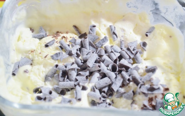 Растопить на водяной бане или в микроволновке 125г. шоколада и добавить во оставшуюся массу. Хорошо перемешать. Выложить массу в контейнер и поставить в морозилку. Через каждые 40 минут доставать и перемешивать мороженое вилкой или миксером.