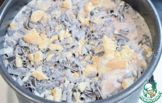 Сверху украшаем раскрошенным печеньем и кусочками шоколада. Накрываем плёнкой и ставим в морозилку на 10-12ч. Храниться такой торт может около 2 недель.