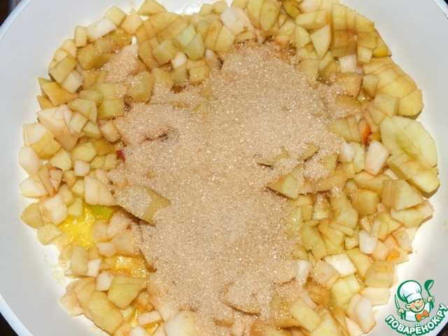 Растопите сливочное масло, выложите яблоки и сахар и обжаривайте минут 5-7