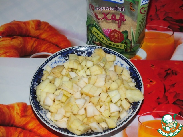 Для начала приготовьте начинку. Для этого яблоки нужно очистить и нарезать кубиками