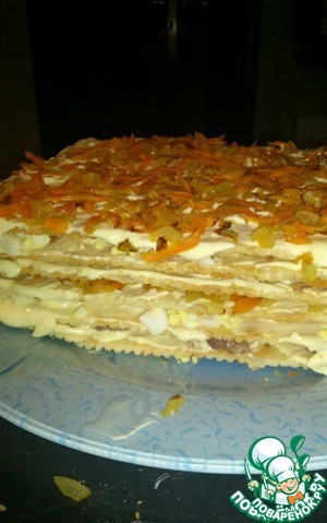 Коржи слоеные для торта "Наполеон" промазываем майонезом. Сайру разминаем вилкой, слив жидкость. Морковь и лук (большие или по 2 средних) пассеруем. Яйца отвариваем.