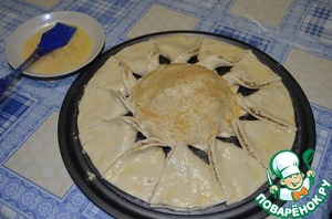Края хорошо смазать яйцом и выложить орехи, смешанные с 0,5 стак. сахара.