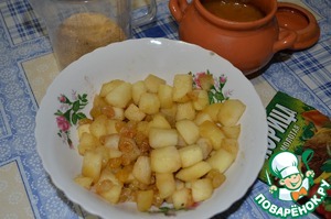 Яблоко почистить, порезать, смешать с изюмом, добавить 0,5 ст. коричневого сахара и поставить на плиту. Нагревать, пока не растворится сахар и яблоки станут мягкими. Добавить корицу.