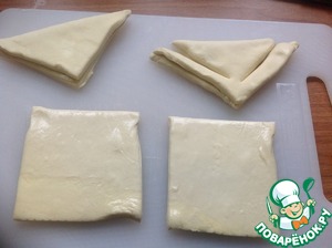 • Тесто разделить на квадраты и сложить в треугольник, сделать надрезы, как на фото. Тесто не раскатывать