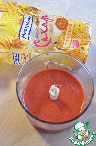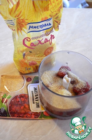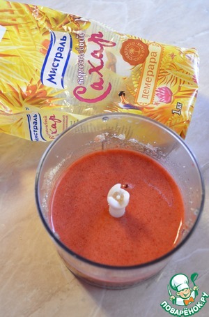 1. Клубнику разморозить, положить в чашу блендера (сок не сливать), добавить сахар, желатин и ванилин.