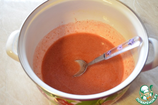 4. Перелить массу в кастрюльку, на медленном огне нагреть, для того, чтобы распустился желатин. Массу не КИПЯТИТЬ.