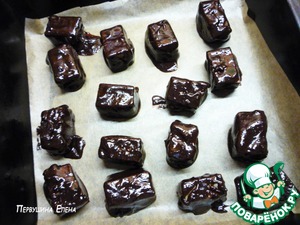 Отправить на холод. Охладить до такой степени, чтоб шоколад застыл, но остался еще немного липким.