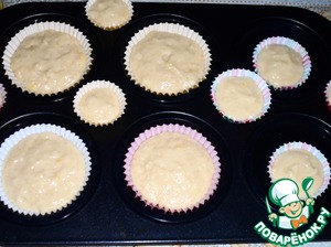 Разложить тесто по бумажным формочкам. У меня формочки разного диаметра.