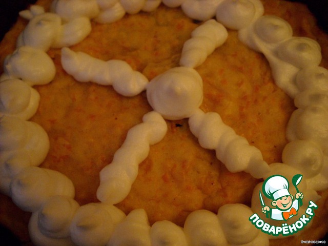 Верхний украсить взбитыми белками, переложить в форму, и подсушить. Охладить