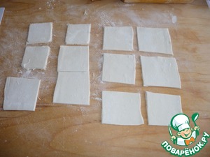 Тесто раскатать и нарезать одинаковыми квадратами. Я немного пролетела с размером, но это дело поправимо.