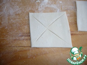 Наложить его на целый квадрат из теста, который смазать водой, для того, чтобы слои скрепились межде собой, отогнуть получившиеся лепестки.