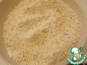 Миндаль перемолоть в некрупную крошку, но не в муку. Добавить муку и сахар.