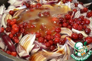 Высыпать в сковороду лук, клюкву, мед, посолить, добавить бальзамик.
