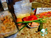 Сваренный рис добавить к овощам. Положить порошок карри по вкусу. Добавить креветки и мелко порезанный зелёный лук. Перемешать. |