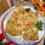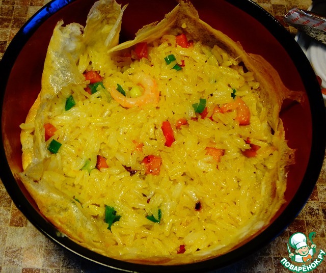 Когда яичница остынет, осторожно положить её в глубокую миску и на неё сложить рис с овощами и креветками и немного утрамбовать. Концы яичницы завернуть на рис. |