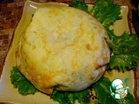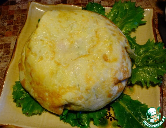 На тарелку, в которой будем подавать наше блюдо уложить свежие листочки салата. Аккуратно перевернуть чашку с рисом. Заправить концы яичницы вниз под рис. |