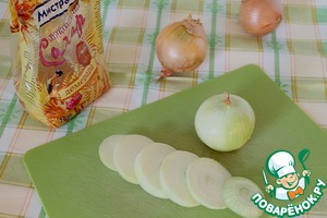 Всё очень просто. Лук режем толстыми кольцами, примерно 0,8 см.