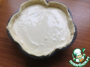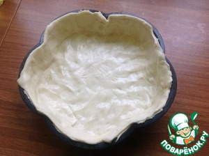 Тесто, не раскатывая, руками выкладываем в форму, разравниваем, обязательно оставляем борта. Лишнее тесто срезаем ножом