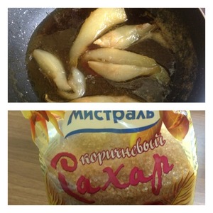 По желанию можно украсить пирог карамелизованной грушей. Для этого очистить грушу от кожи и семян, разрезать на 8 частей. В сковороду положить 20 г масла сливочного и 3 ст. л. сахара мистраль, дать раствориться сахару, выложить грушу и потушить ее.