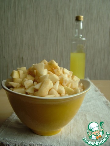 Очищаем яблоки, нарезаем некрупными кусочками, добавляем 5 ст. ложек рома и хорошо перемешиваем. Накрываем крышкой или пленкой и оставляем яблоки пропитываться ароматным алкоголем. За неимением рома я использовала лимонный ликер. Тоже очень вкусно и ароматно. А мы тем временем займемся непосредственно тестом.