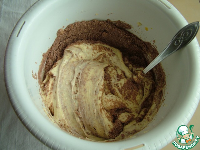 Добавляем просеянную вместе с разрыхлителем муку и перемешиваем тесто. Духовку разогреваем до 175С.
