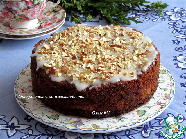 Выпекаем пирог 60 минут. Готовность проверяем деревянной лучинкой. Для глазури смешиваем сахарную пудру, несколько ложек рома и лимонный сок. Миндаль обжариваем на сухой сковороде. Покрываем остывший пирог глазурью и посыпаем миндальной крошкой.