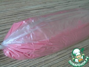 Бисквит развернуть, смазать кремом (часть оставить для украшения), выложить начинку-сердце.