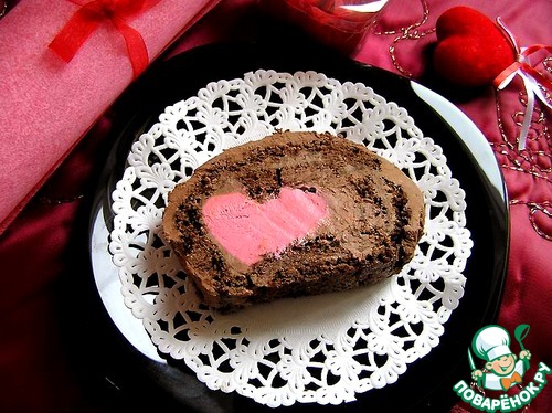 Невероятно нежный праздничный рулет! В меру сладкий, с ярко выраженным шоколадным вкусом, а также с кислинкой и горчинкой, присущими ягоде калине (кстати, Вы можете использовать другую ягоду). А начинка в виде сердца будет сладким признанием для Вашего избранника! Попробуйте ;)