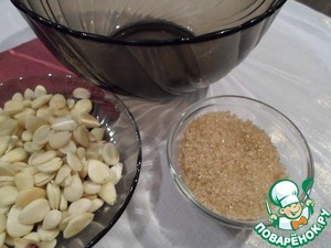 Сначала займемся печеньем Amaretti. Вариантов его рецепта огромное количество. Я остановилась на одном из них, немного его изменив. Берем миндаль, коричневый сахар Мистраль. Разбиваем яйцо, белок отделяем в сухую чистую мисочку, желток нам здесь не пригодится. 1/4 миндаля можно заменить на абрикосовые косточки для яркости вкуса. Если Вам по каким-то причинам не нравятся абрикосовые косточки, или имеется миндальная эссенция, можете использовать для приготовления только миндаль.