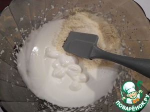 Белок с щепоткой соли взбиваем до появления пены, потом вводим 14 г сахара и взбиваем уже до жестких пиков. Затем аккуратно перемешиваем с миндальной мукой и ванилином.