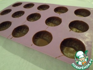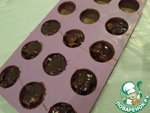 Теперь перейдем непосредственно к изготовлению конфет. Растапливаем 80 г шоколада, наносим большую его часть тонким равномерным слоем на 10 формочек для конфет. Я сначала хватила лишку, и сделала из расчета на 15 штук, поэтому у меня потом остались незаполненные ячейки. После нанесения шоколада несколько раз слегка ударяем формочкой об стол, чтобы поверхность конфет впоследствии получилась ровной и гладкой, замазываем шоколадом неровности, если они есть. Охлаждаем до комнатной температуры и ставим в холодильник застывать.