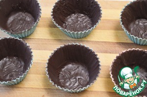 1/3 шоколада отложить, остальной растопить на водяной бане. Как только шоколад растопится, добавить отложенный и перемешать до однородного состояния. Кисточкой покрыть силиконовые формы для кексов шоколадом и убрать на пару минут в холодильник. Затем достать и покрыть шоколадом еще раз. Формочки должны быть хорошо покрыты, без просветов. Если нужно, можно смазать и третий раз. Убрать в холодильник, чтобы шоколад хорошо застыл.