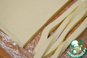 Прямоугольную форму застелить пищевой пленкой, вылить смесь слоем примерно 0,5-1 см и убрать в холодильник. Когда желе застынет, нарезать его кубиками.