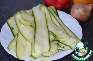 Цукини порезать по всей длине с помощью чистилки для картошки! Вскипятить воду и бросить туда полоски цукини. Вариться они не должны, только стать чуть мягче! Слить воду, дать остыть!