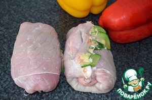 Мясо свернуть рулетиком и связать с помощью нитки. У меня были иголки для скрепления рулетиков. Очень удобно! Вот такие получаются они, если положить много начинки!