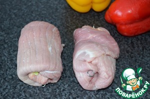 • Мясо свернуть рулетиком и связать с помощью нитки. У меня были иголки для скрепления рулетиков. Очень удобно! Вот такие получаются они, если положить много начинки!