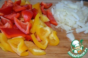 • Сковороду смазать подсолнечным маслом и обжарить на ней рулетики с обеих сторон. Добавить лук, немного обжарить и следом паприку. Потушить недолго всё вместе.