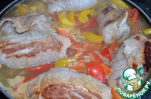 Сковороду смазать подсолнечным маслом и обжарить на ней рулетики с обеих сторон. Добавить лук, немного обжарить и следом паприку. Потушить недолго всё вместе.