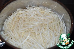 Вскипятить воду. Пока вода кипит, натереть на корейской тёрке корневой сельдерей. Вода вскипела, добавить уксус и сельдерей. Плиту выключить, но с плиты кастрюльку не убирать и дать немного настояться (примерно 10 мин).