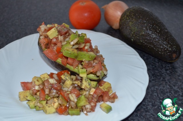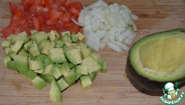 Чищенный авокадо, репчатый лук и помидоры порезать кубиком. У другой половинки вынуть немного мякоть (с помощью ложки) и присолить, не чистить.