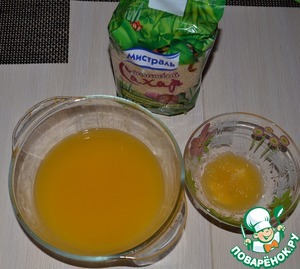 Желатин распускаем в микроволновой печи и добавляем в мандариновый сок. Разливаем по креманкам и убираем в холодильник.