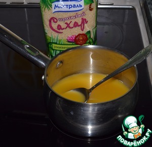 Мандариновый сок перельем в сотейник и добавим сахар, прогреем на плите до растворения сахара, но не кипятить!