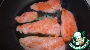 Куриное филе посолить и поперчить по вкусу (я использовала приправу "Для курицы"), обжарить с двух сторон (я это делала на сковороде) до полуготовности, минут 5-7.