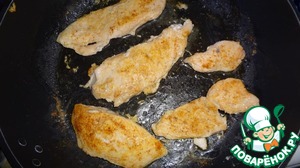 • Куриное филе посолить и поперчить по вкусу (я использовала приправу "Для курицы"), обжарить с двух сторон (я это делала на сковороде) до полуготовности, минут 5-7.