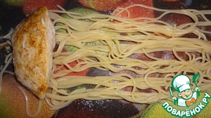 • Разложить спагетти на доске, выложить грудки, завернуть их в макароны.