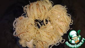 • Спагетти отварить до готовности, воду слить, слегка остудить.