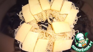 • Поверх уложить нарезанный тонким слоем сыр (можно использовать плавленный в ломтиках).