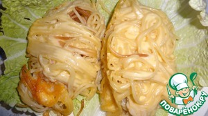 Разложить спагетти на доске, выложить грудки, завернуть их в макароны.